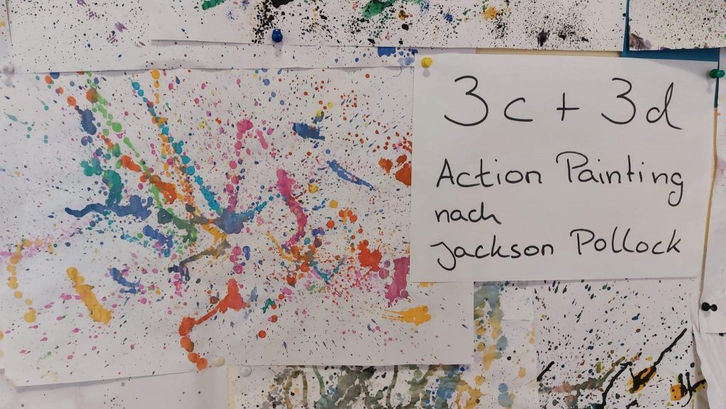 Action Painting- Aktionsmalerei? Schon mal gehört? Nein? Unsere Drittklässler*innen schon! Im Kunstunterricht haben sie sich nämlich von Jackson Pollock und seiner Kunst inspirieren lassen und haben ihre Farbe wahllos durch Spritzen, Klecksen, Gießen aufs Papier gebracht. Der Ausdruck und die Kraft der Bilder ist dem puren Zufall überlassen.