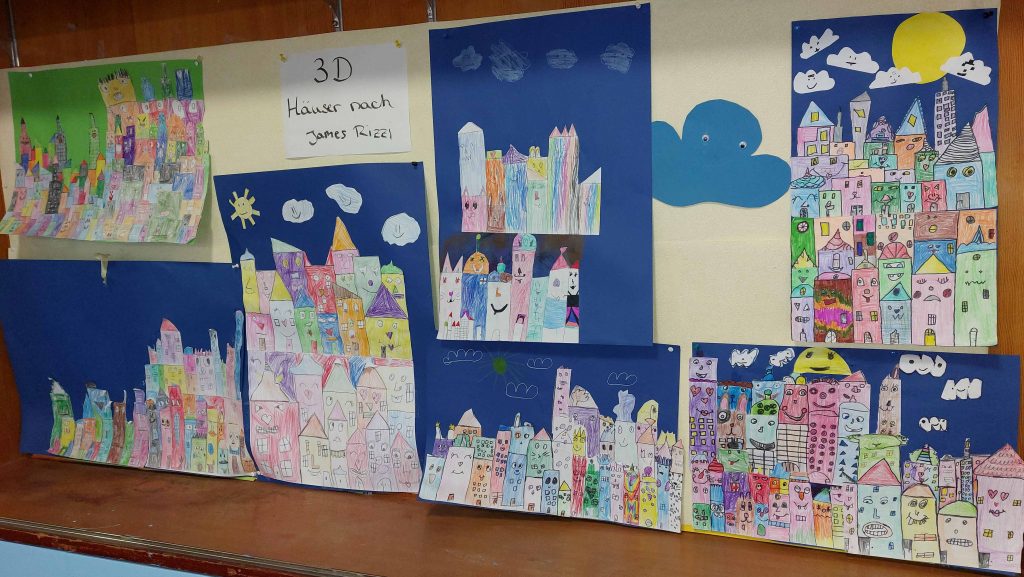 Lebensfrohe Häuser im Stil von James Rizzi hat die 3d gestaltet. Nun hängen sie in der Pausenhalle und strahlen Kreativität und Fröhlichkeit aus.