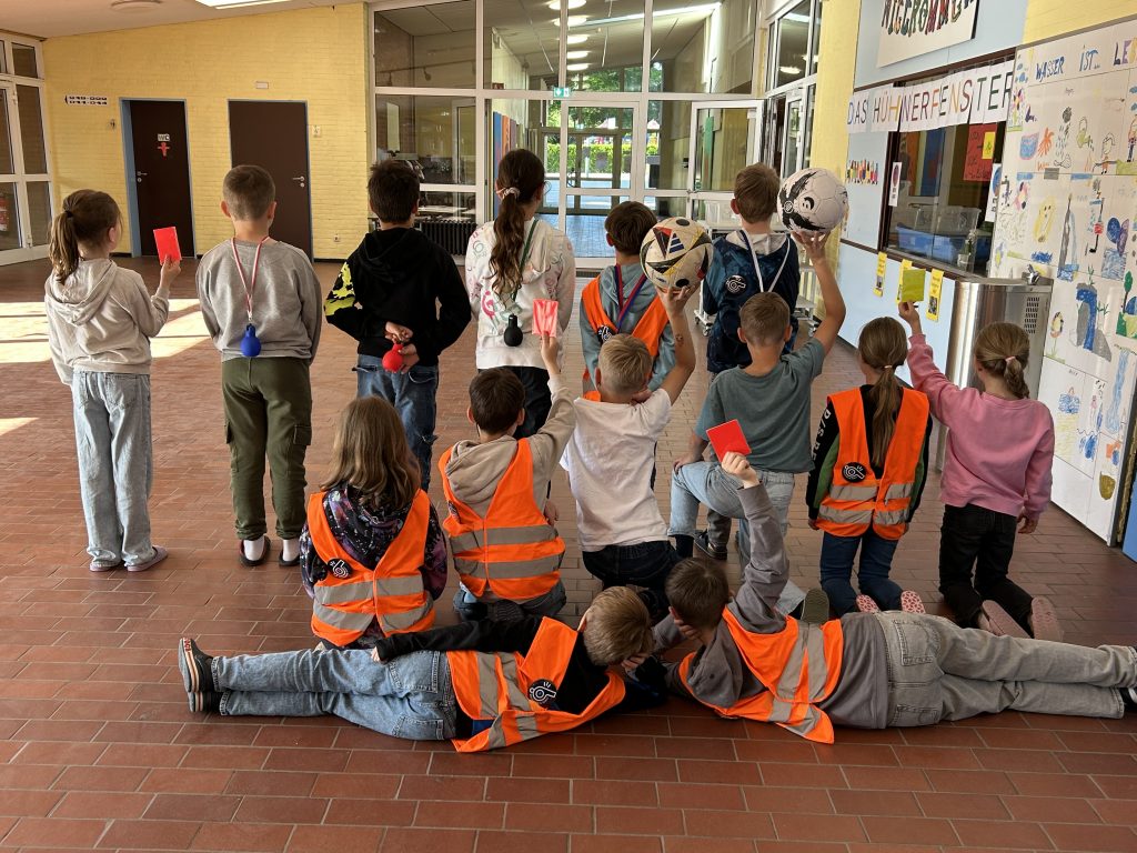 Damit es wirklich fair zugeht, haben sich eine ganze Menge Kinder zum Schul-Schiedsrichter ausbilden lassen. Ihre Aufgabe ist es auf dem wirklich stark umkämpften und hochfrequentierten Soccer-Feld die Fußballregeln durchzusetzen und als erste*r Ansprechpartner*in bei strittigen Fragen präsent zu sein. Wir wünschen allen Fußballer*innen fröhliche und faire Pausenmomente und sagen vielen Dank an die freiwilligen kleinen und großen Schiedsrichter*innen.