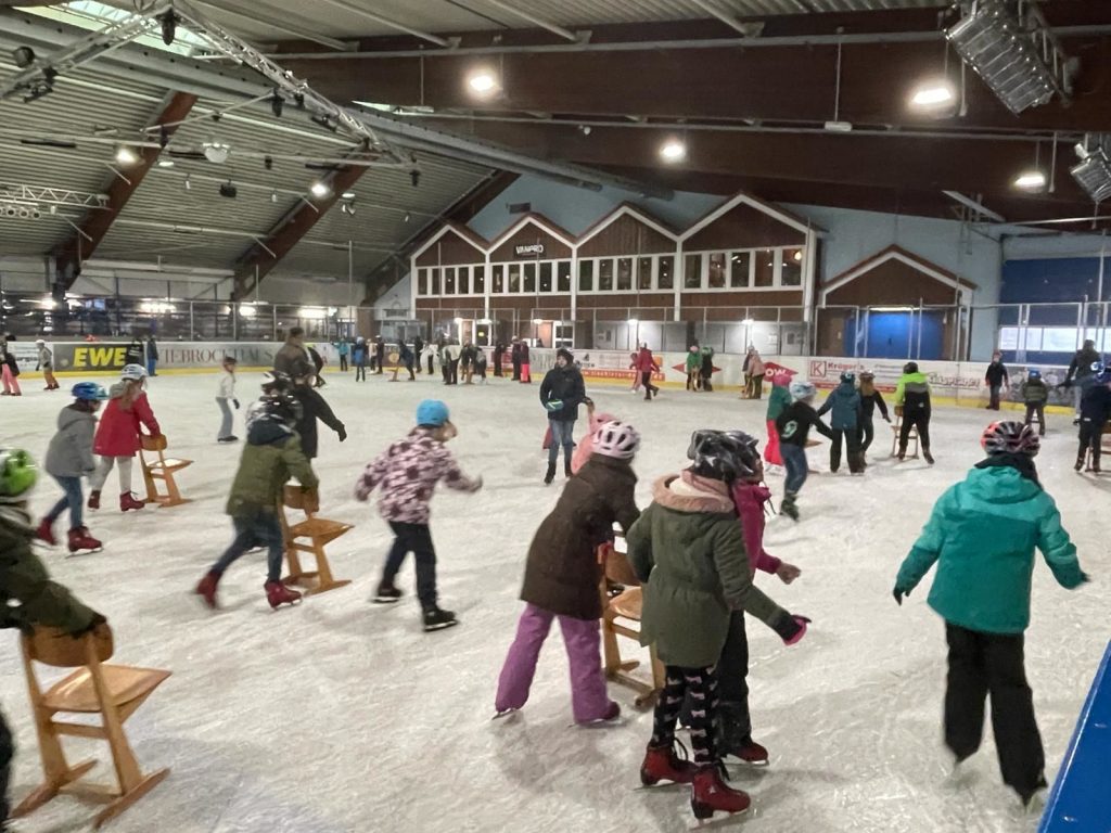 Am Montag sind die Kinder der Jahrgänge 2, 3 und 4 zum traditionellen jährlichen Schlittschuhlaufen gefahren. Morgens um 8:30 Uhr ging es mit den vollbesetzten Bussen nach Harsefeld. Alle Kinder und Erwachsenen waren dick angezogen. Wer aufs Eis wollte hatte entweder eigene Schlittschuhe dabei oder konnte sich in der Eissporthalle welche leihen. Anfänger durften sich an Holzstühlen festhalten oder wurden von anderen Kindern beim Laufen und Gleiten unterstützt. Helm und Handschuhe waren Pflicht und haben die Sauserei sicher gemacht.