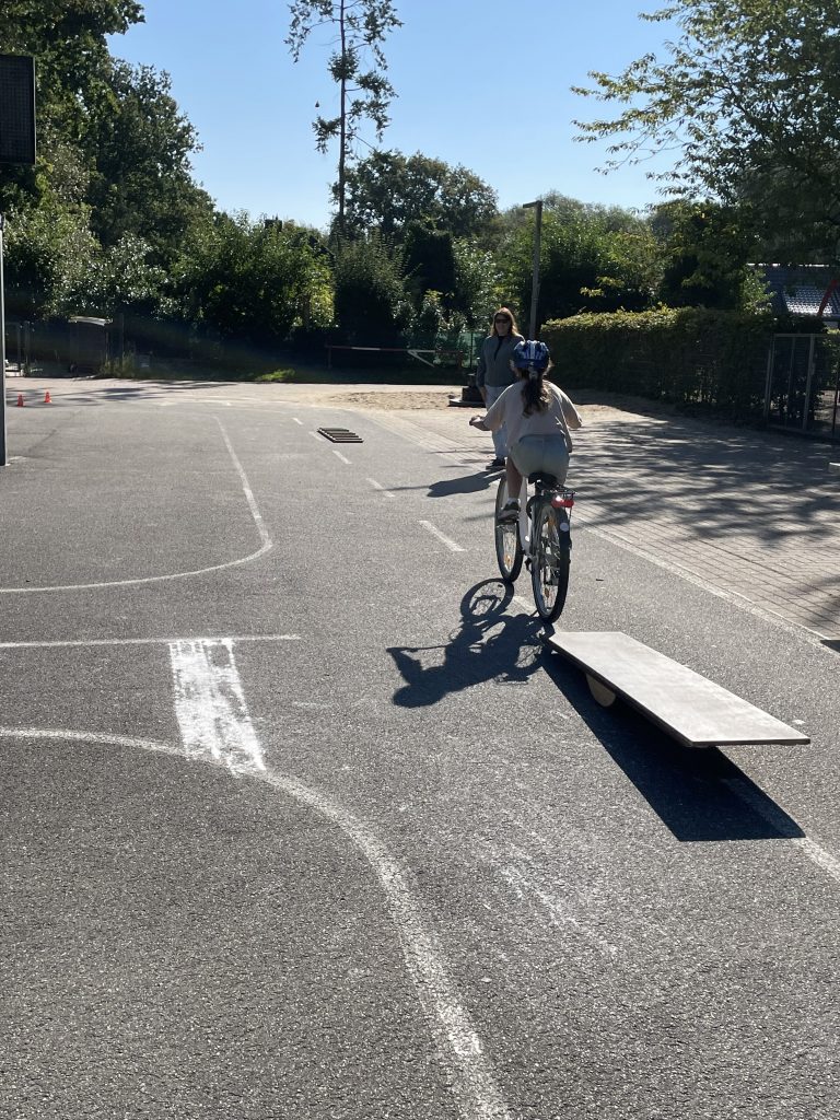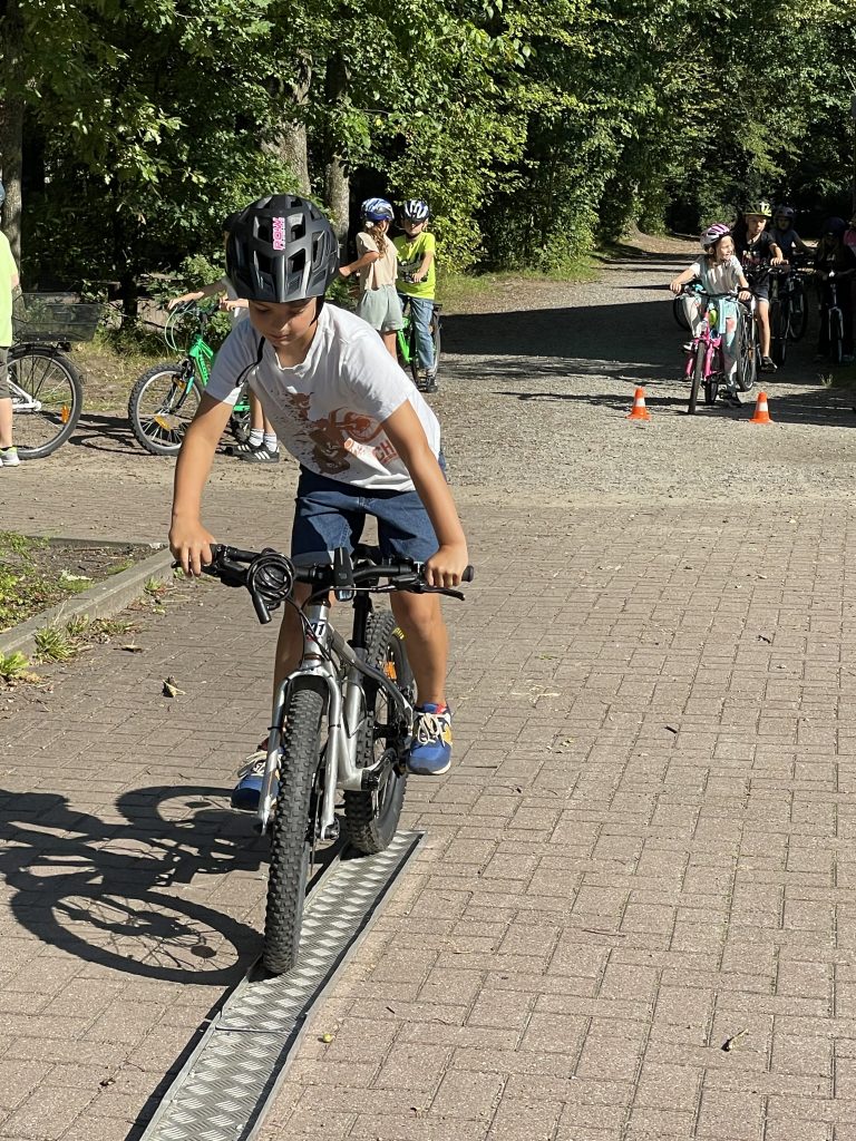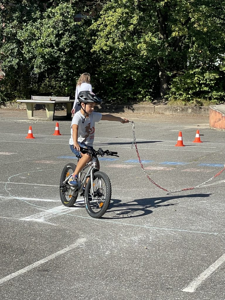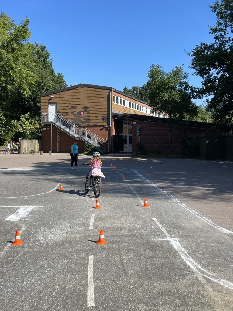 Am 28. und 29. August hatten die Schüler und Schülerinnen der dritten und vierten Klassen die Gelegenheit an verschiedenen Stationen ihr Geschick im Umgang mit dem Fahrrad zu trainieren. Hierzu wurden ein Slalom, eine Wippe, eine enge Kurve, verschiedene Spurbretter und zwei Stationen, an denen das Handzeichen beim Linksabbiegen geübt wurde, aufgebaut. Die Kinder hatten sich sehr darauf gefreut, ihr Können zu zeigen. Wie bei vielen Dingen, macht auch hier Übung den Meister. Parallel zu dem Geschicklichkeitsparcours der Verkehrswacht Harburg hat die Hollenstedter Polizei die Fahrräder auf ihre Verkehrssicherheit überprüft und war sehr zufrieden mit dem Befund. Die Schule bedankt sich ganz herzlich bei allen Helferinnen, die bei sehr warmen Temperaturen den Parcours aufgebaut und während des gesamten Schulvormittags betreut haben.