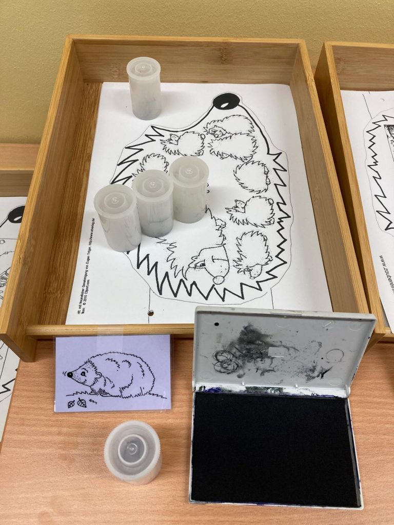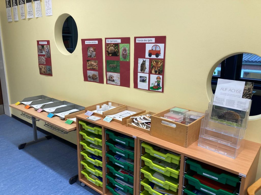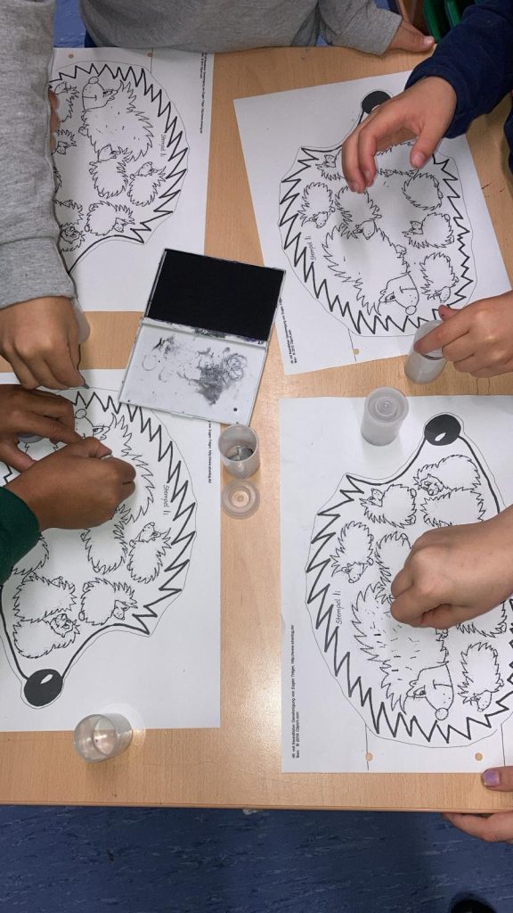 In der Klasse 1b ist der Herbst eingezogen. Die kleinen Forscher*innen arbeiten selbstständig an einer Stationenarbeit zum Igel. Da wird fächerübergreifend (vor)gelesen, gestempelt, gezählt, gemalt und gesungen.