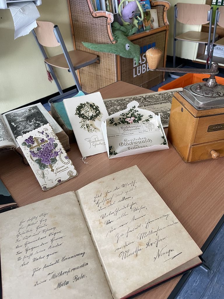 In Sachunterricht über „Schule und Leben früher“ viel zu erfahren, das ist schon sehr interessant. Wenn man aber auch noch das große Glück hat – und eine engagierte Mutter Zeit – dann ist es toll, alte Schriften und altes Spielzeug kennenzulernen -einen uralten Teddybären, eine Puppe, die nur noch durch Kleidung zusammenhält und Spielzeug, das im letzten Jahrhundert bespielt wurde. Etwas Besonderes durfte jedes Kind probieren: Kaffeebohnen in einer Mühle selber mahlen. Alle Schüler*innen hatten viel Spaß an diesem praktischen und handlungsorientierten Unterricht und es war sehr interessant, zu jedem Teil eine kleine Geschichte zu hören. Die Kinder durften das Alter von verschiedenen Dingen schätzen, was ihnen aber gar nicht leicht fiel. Ein großes Dankeschön für diese informative Schulstunde!