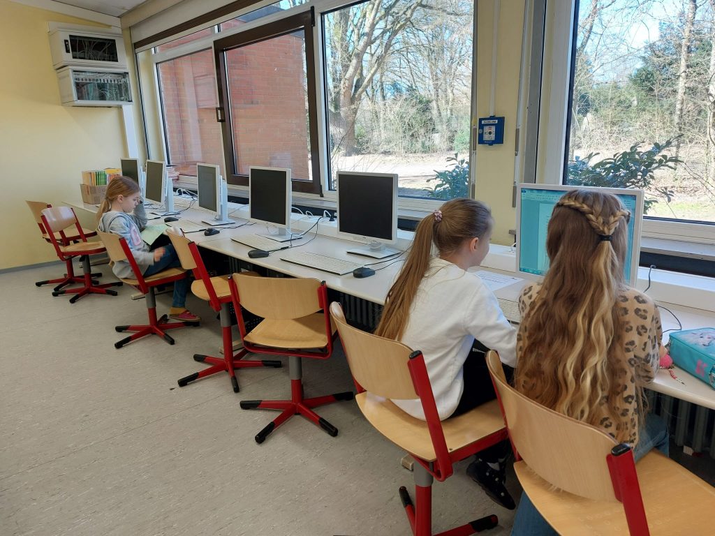 Im Deutsch Forderunterricht arbeiten die Kinder fleißig an einer Zeitung. Dabei haben sie selbstständig Themen verhandelt, Texte handschriftlich vorgeschrieben und nun wird getippt. Der Computerraum wird zur Redaktion.