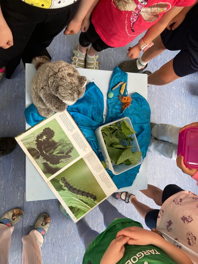 Die Klassen im Jahrgang 1 beschäftigten sich zum Ende des Schuljahrs mit dem Schmetterling. Anhand des Insekts. Das Arbeiten mit Zeichnungen, Bestimmungsbildern und Bestimmungsbüchern, Beschriften, Lesen und die Veranschaulichung am Realobjekt bilden viele wichtige Kompetenzen für das Lernen aus und wecken das Interesse der jungen Schüler*innen.