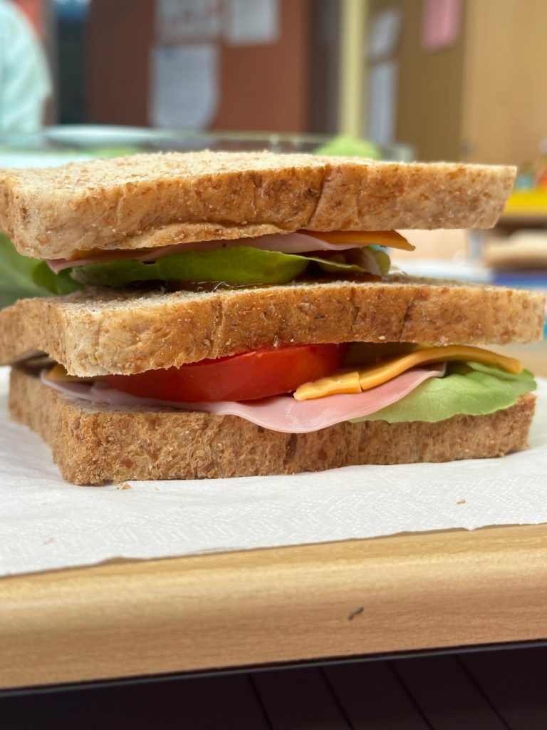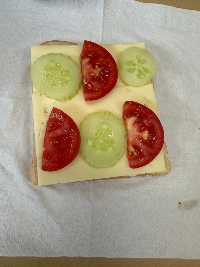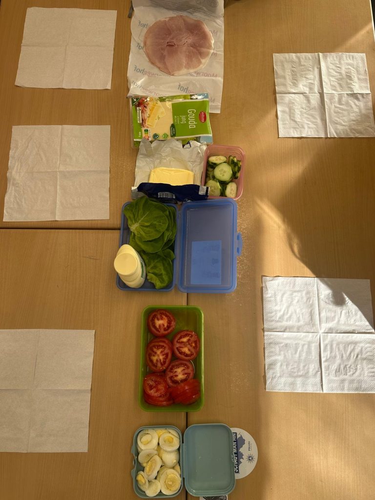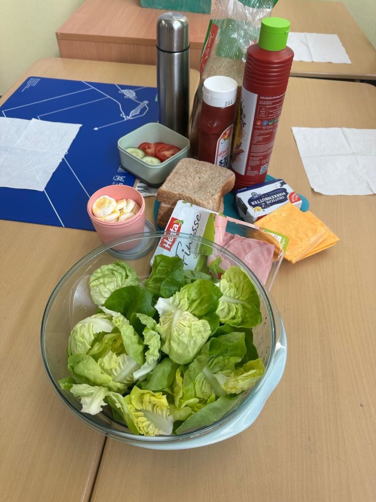 Die Klasse 4a hatte die Idee, selber Sandwich im Unterricht zu machen, nachdem sie die Vokabeln für die Zutaten im Englischunterricht thematisiert wurden – ham, cheese, tomato, bread … Die Kinder haben sich in Gruppen abgesprochen, wer was mitbringt. Alle Zutaten wurden fix und fertig in vielen Plastikdosen im Kühlschrank vom Kiosk bis zur 5. Stunde aufbewahrt. Dann konnte es losgehen mit der Sandwichparty! Die kam nach der vorangegangenen Sportstunde genau richtig. Der Appetit war groß. Es gab abwechslungsreiche Kreationen und den Wunsch nach einer baldigen Wiederholung.