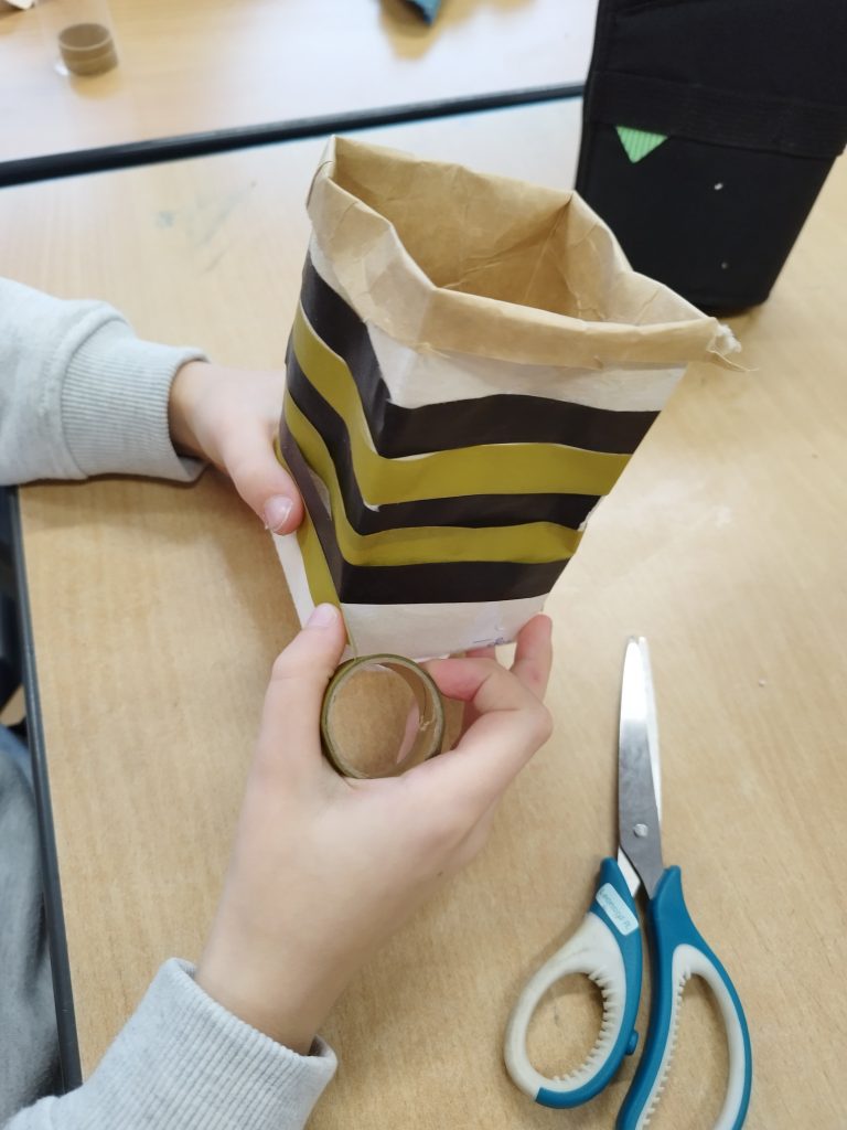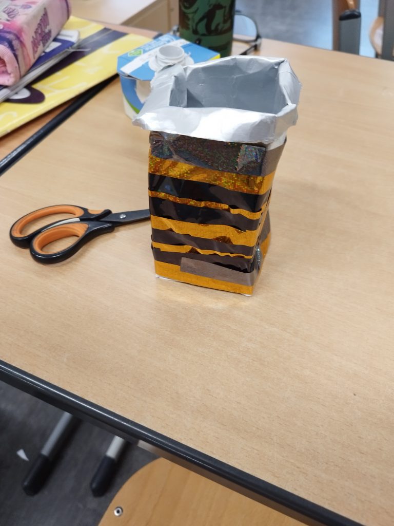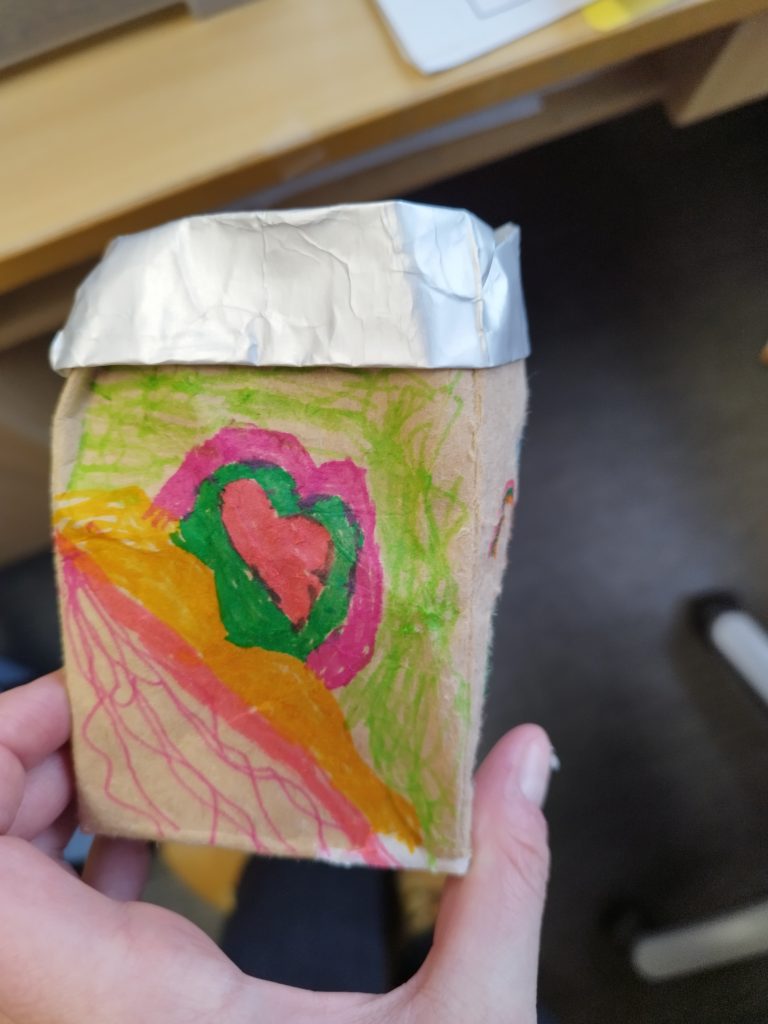 Im Sachunterricht zum Thema Müll hat die 2d aus Tetrapack-Tüten kleine Aufbewahrungsbehälter gebastelt. Die Milchtüten, die sonst in den Müll wandern würden, werden also zu etwas Neuem aufgewertet. Zuerst wurden die Milchtüten aufgeschnitten und dann zerknüllt. Erst dann kann die Beschichtung gelöst werden. Am Ende wurden sie noch mit Tape und Stiften verziert.