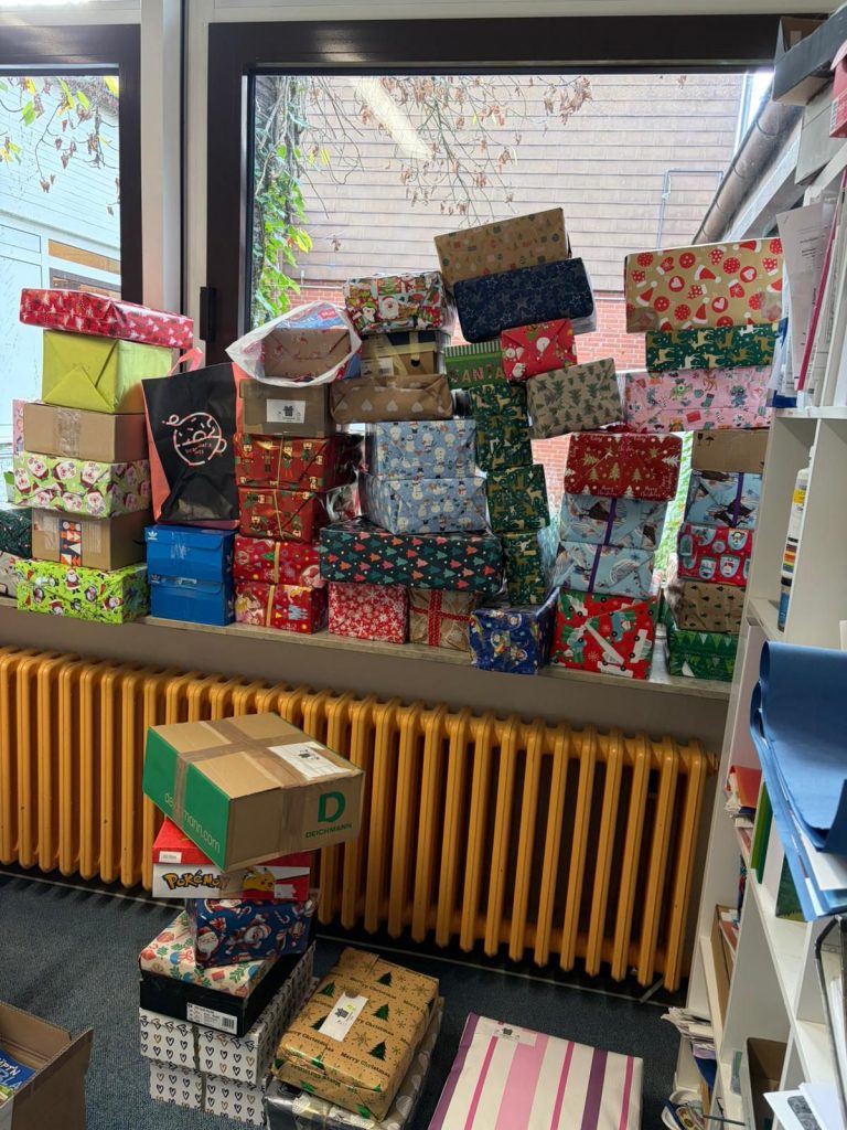 In mittlerweile mehrjähriger Tradition haben die Kinder der Glockenbergschule auch in diesem Jahr wieder Geschenke im Schuhkarton verpackt. Gut erhaltenes gebrauchtes Spielzeug ist aus den Kinderzimmern der Schüler*innen sortiert worden, in einem Schuhkarton gelandet, liebevoll verpackt und um Hygieneartikel und kleine Naschereien ergänzt worden. Diese bunten Geschenke sammeln die Kolleg*innen gemeinsam mit dem Round Table Buchholz für Kinder in den ärmsten Regionen Osteuropas. In einem großen Konvoi werden die Päckchen rechtzeitig zu Weihnachten von vielen ehrenamtlichen Helfer*innen dorthin transportiert. So kann das Weihnachtsfest auch im Jahr 2025 von Kindern für Kinder bereichert werden. Wir danken dem Round Table Buchholz für dieses Engagement und allen Hollenstedter Familien, für ihren Beitrag. Diese Aktion ist nicht nur ein Geschenk für die Päckchenempfänger, sondern auch ein wichtiger Beitrag für die politische und soziale Bildung der schenkenden Kinder.